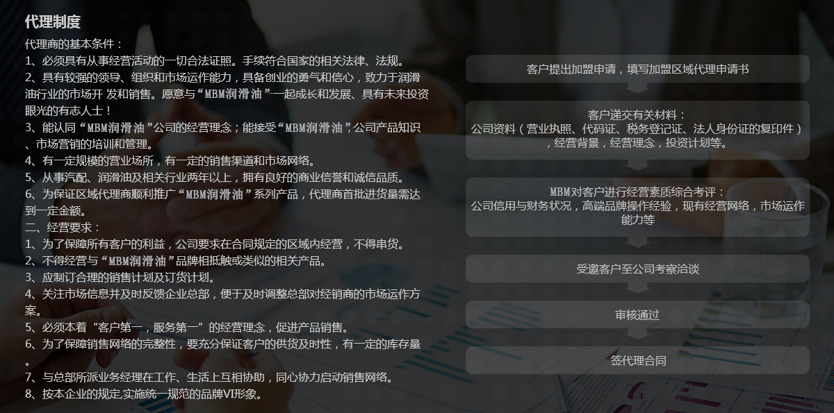 5、業(yè)務(wù)支持:不定期派遣業(yè)務(wù)管理人員、營銷策劃人員、協(xié)助銷售人員幫助代理商開拓市場。